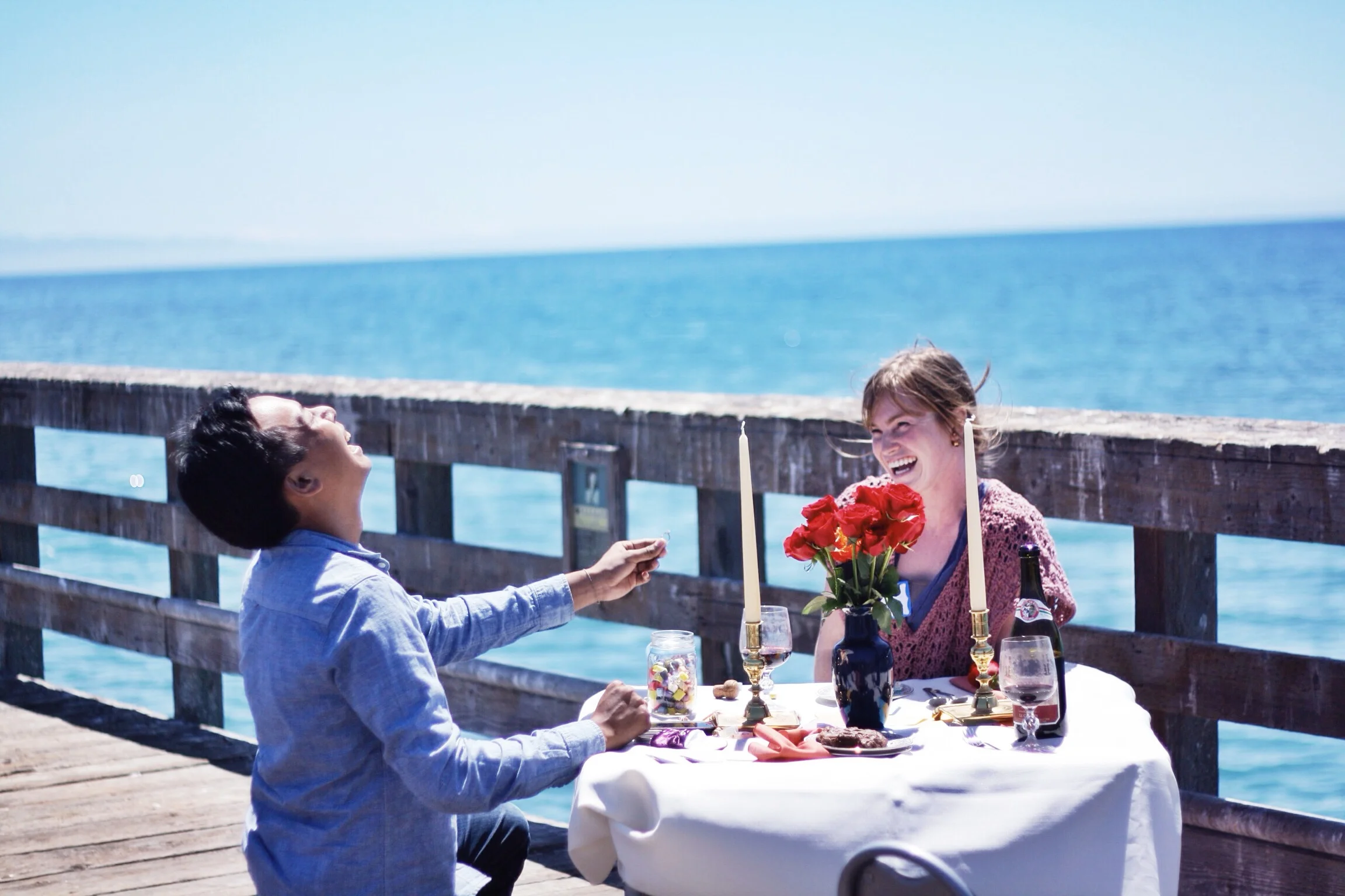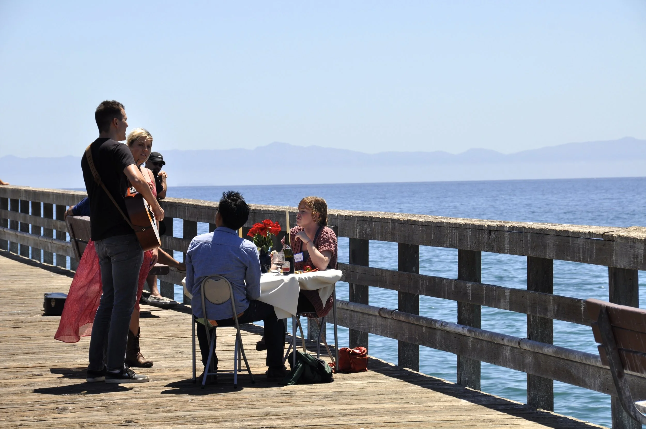 We parked by the beach and walked towards the pier, and we saw Evan, her cousin, who greeted us as a waiter and walked us down the pier, up to a table set for two.